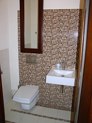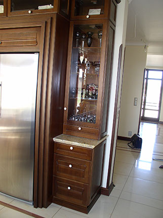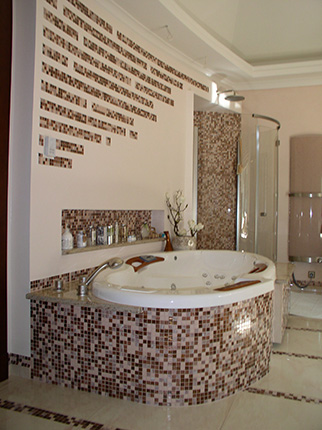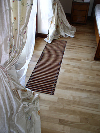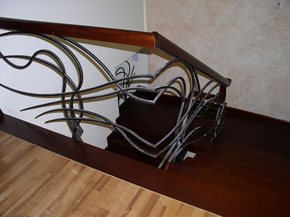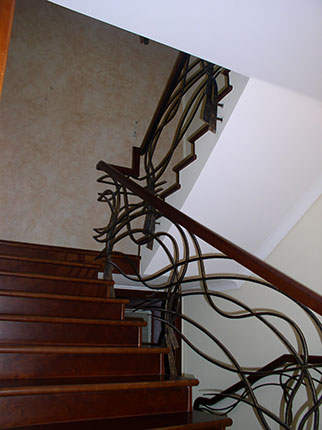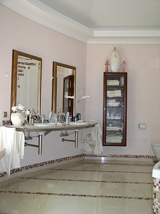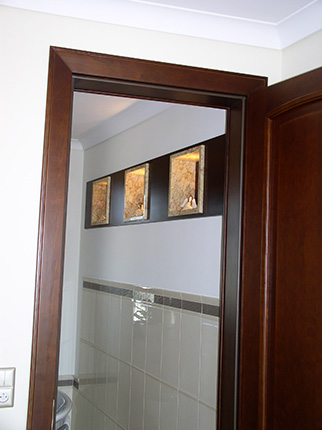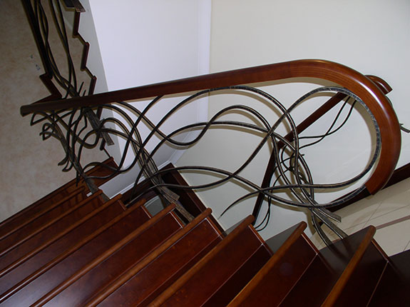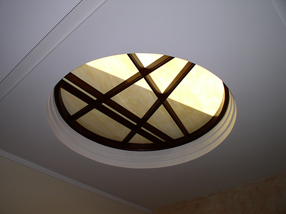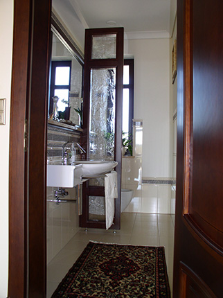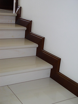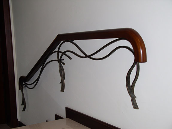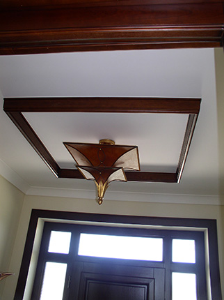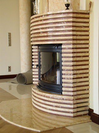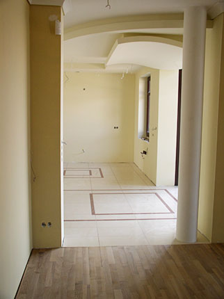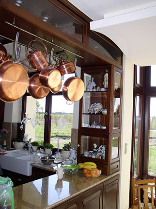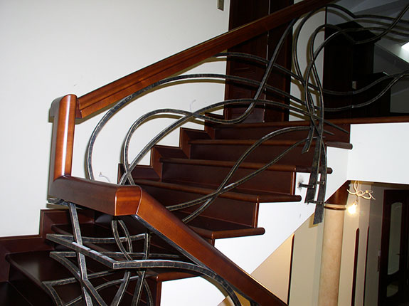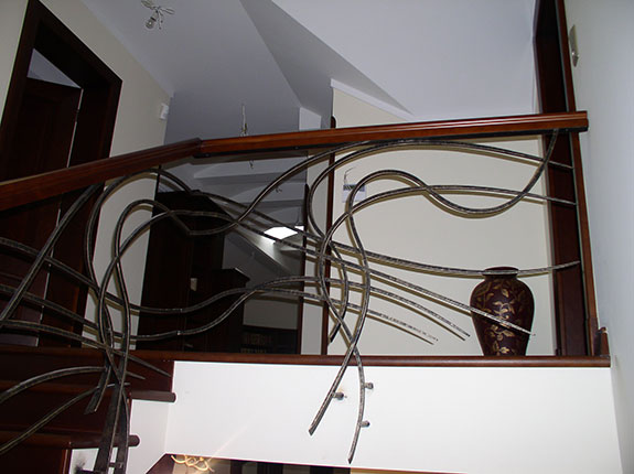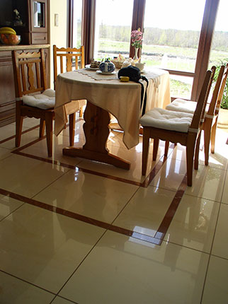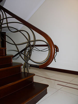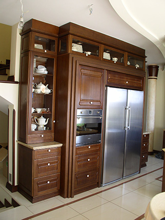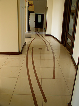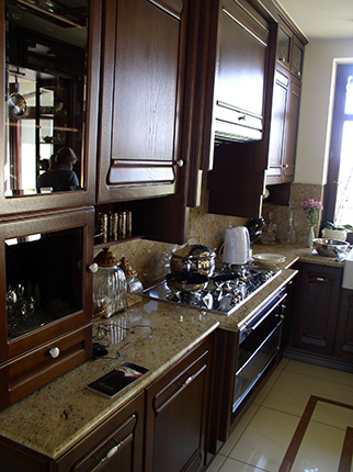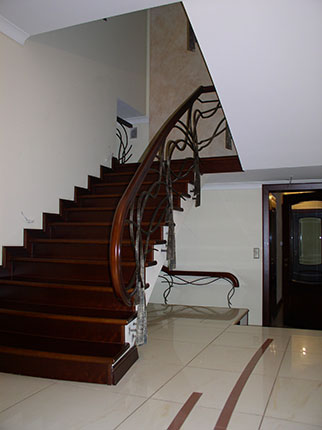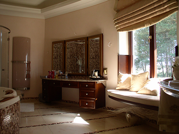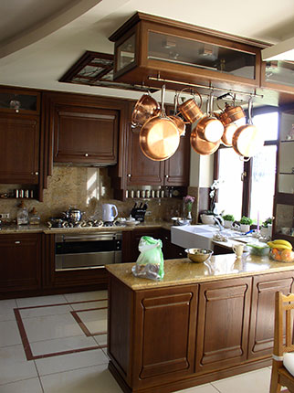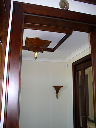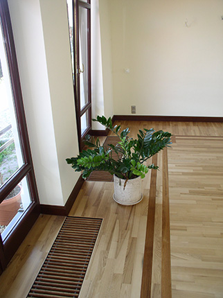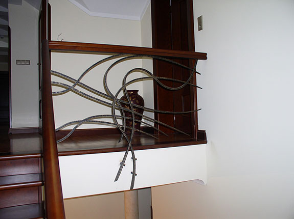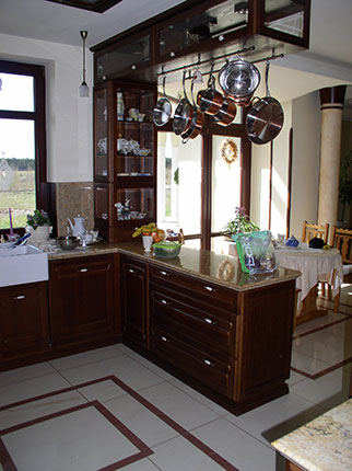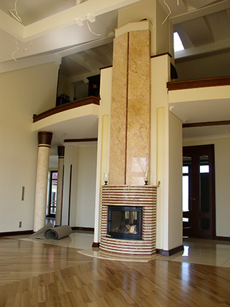 Dużo wolnej przestrzeni wypełniono fakturami z naturalnych materiałów jak kamień, ceramika i drewno. Indywidualna stolarka wewnętrzna, detale głowic słupów, drewniane elementy dekoracyjne na sufitach, stalowa współczesna barierka schodów, delikatne wzory w podłogach ceramicznych i drewnianych, zaprojektowane meble kuchenne tworzą bardzo indywidualny, zharmonizowany klimat akceptowany przez domowników.